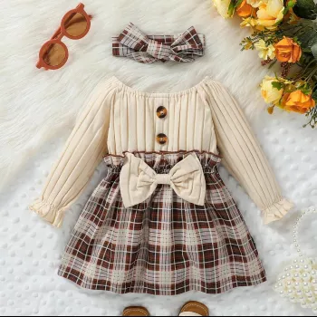 Autumn Long Sleeve Plaid Dress with Bow for Baby Girls